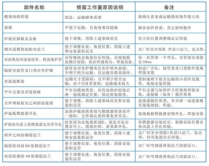 加熱爐及其它爐類產(chǎn)品可進行工廠模塊化設(shè)計、預制、運輸及現(xiàn)場安裝。采用思路:工廠深度預制一部件組合運輸一現(xiàn)場快速組對安裝、調(diào)試。加熱爐模塊化設(shè)計及工廠模塊預制的優(yōu)點有:供貨范圍和各方責任清晰明確、減輕業(yè)主采購工作量、減少現(xiàn)場施工量及制作場地、能更好的保證施工工期和質(zhì)量、減少現(xiàn)場施工量及制作場地。我們可根據(jù)設(shè)計總圖提前進行模塊化設(shè)計、確定模塊預制方案、模塊運輸方案及現(xiàn)場拼裝方案,再報業(yè)主和設(shè)計方確認,從而節(jié)省設(shè)計時間。隨著加熱爐大型化的趨勢,以及道路運輸?shù)倪M一步規(guī)范,工廠預制模塊的尺寸設(shè)計應盡量能控制在:長22米,寬3.0米,高度3.3米以內(nèi)。
